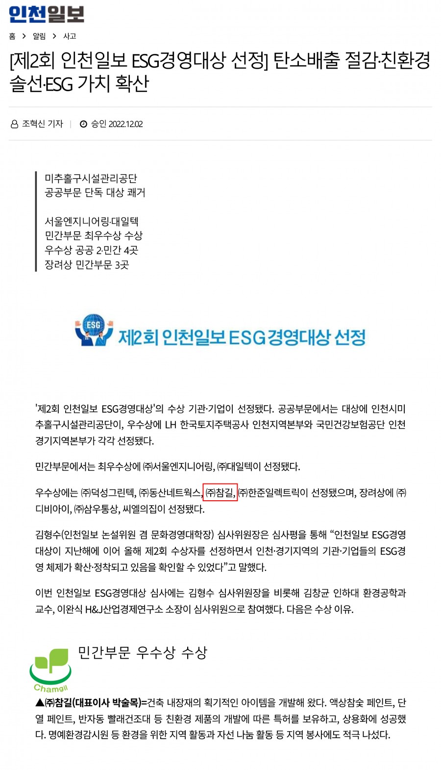 인천일보 제2회 ESG경영대상 민간부문 우수상 수상 페이지 정보 작성자 최고관리자 작성일22-12-07 15:08 조회27,520회 댓글0건 관련링크 본문 인천일보 제2회 ESG경영대상 민간부문 우수상 수상 댓글목록 등록된 댓글이 없습니다. 이전글 다음글 목록